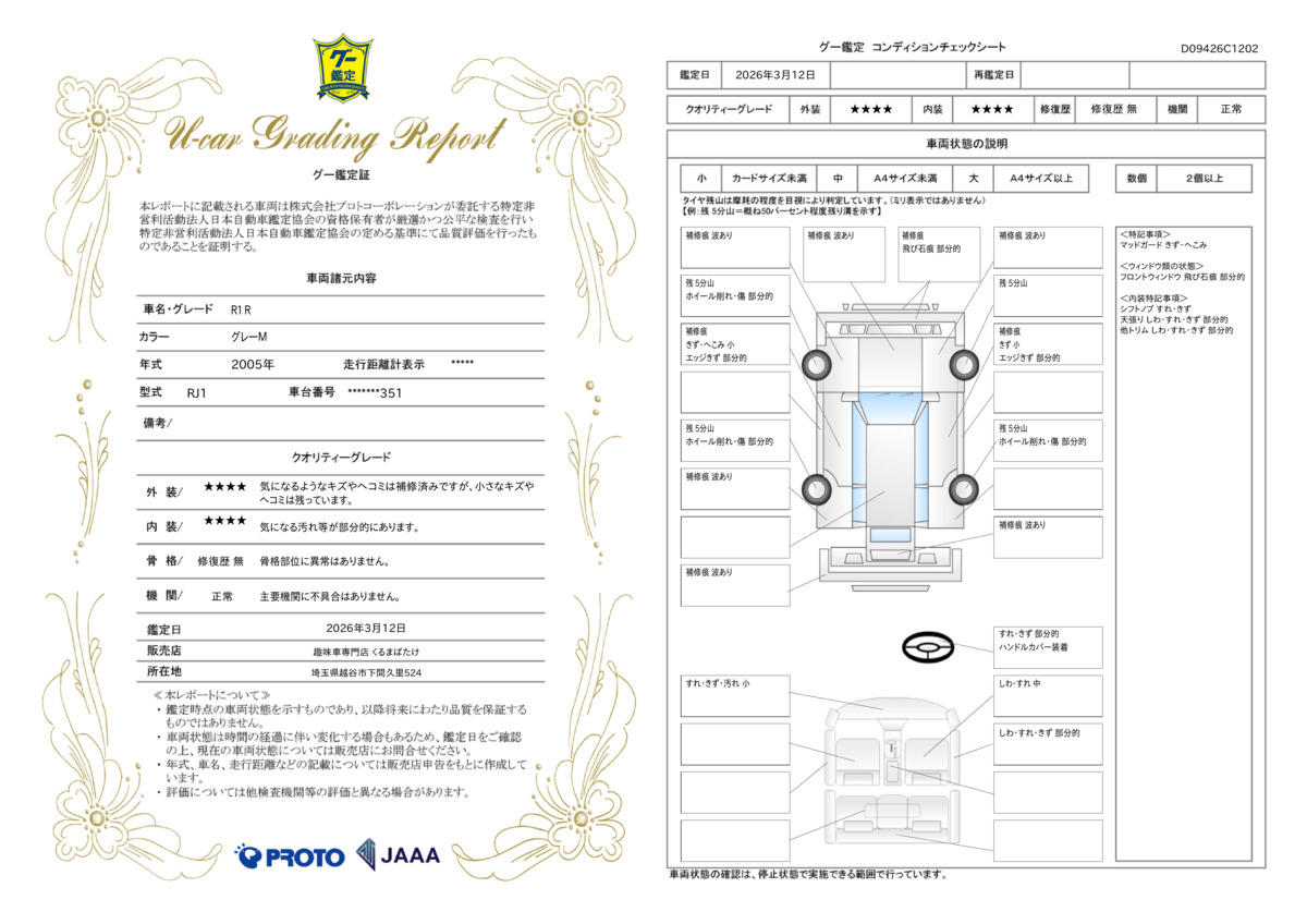 日本自動車鑑定協会(JAAA)にて外装4点・内装4点評価のお車です。走行管理システム合格&修復歴無しのお車でございます。